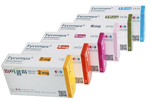 파이콤파는 12세 이상의 뇌전증 환자에서 이차성 전신발작을 동반하거나 동반하지 않는 부분발작 치료 부가요법에 있어 보험 적응증을 받았으며, 1일 1회 용법으로 용량은 2mg, 4mg, 6mg, 8mg, 10mg, 및 12mg으로 출시됐다.