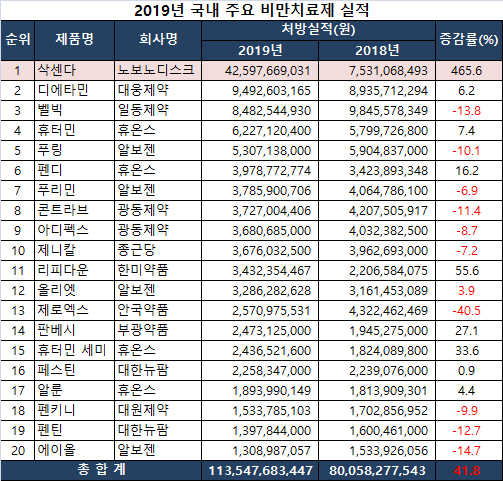 삭센다의 등장으로 기존 품목들이 고전 중인 가운데 휴온스와 알보젠코리아가 보유한 품목은 정반대 결과를 보여 희비가 교차됐고, 중위권 품목들의 순위가 요동쳤다.메디팜스투데이가 아이큐비아 데이터를 토대로 지난해 국내 주요 비만치료제 20개 품목을 살펴본 결과, 시장규모는 전년 대비 41.8% 증가한 1135억원을 기록했다.