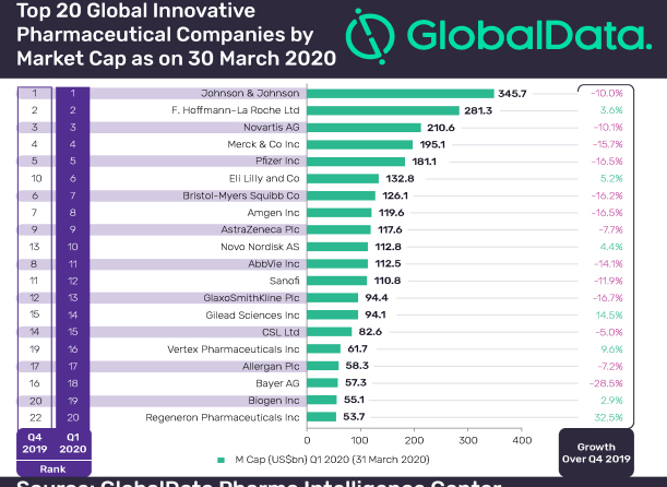 컨설팅업체인 글로벌데이터의 보고서를 보면, 톱 20대 글로벌 제약사의 대다수가 올해 1분기 전체 시가총액이 2.6조 달러 감소했다.
