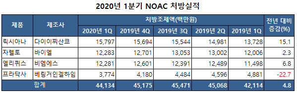 메디팜스투데이가 유비스트 자료를 토대로 올해 1분기 NOAC 시장을 살펴본 결과 오리지널 4품목의 총 처방실적은 441억원으로 전년 동기 대비 4.8% 증가했다.품목별로 보면 릭시아나는 지난해 1분기 137원에서 15.1% 증가한 158억원을 달성했다. 지난해 1분기 선두로 나선 이후 1위를 유지하며 2위와의 격차를 더욱 벌리고 있다.