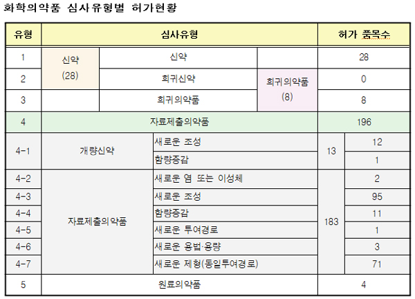 신약 허가는 전년 15품목(12성분)에서 35품목(21성분)으로 20품목이나 증가했으며, 국내 개발 개량신약은 6품목(1성분)에서 13품목(11성분), 바이오시밀러는 7품목(2성분)에서 3품목(2성분)으로 꾸준히 개발됐다.화학의약품 신약 중 국내(4개 품목)는 전이성 결장직장암 치료와 파킨슨 증후군 치료제 각 2개 품목, 생물의약품 신약의 경우 모두 수입(7개 품목)으로 백혈병치료제, 골다공증치료제 등이 허가됐다.