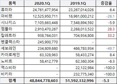 대표 품목 휴미라(성분 아달리무맙)는 전년 동기 대비 6.4%대 성장을 보이며 전체 하락 기조에 방어막 역할을 했다.