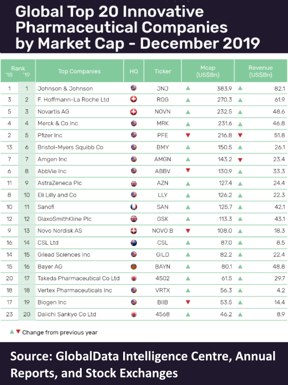 반면 HER2 약품 엔허투(Enhertu, trastuzumab deruxtecan)에 대해 아스트라제네카와 69억 달러 라이선스 합의를 한 다이이찌 산쿄도 3단계 상승한 20위로 현재 애브비에 흡수된 엘러간의 자리를 대체했다.J&J, 로슈, 노바티스가 2019년 시총으로 톱3 제약사였다.