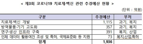 코로나19와 관련한 바이오·의료기술 개발에도 175억원이 추가로 편성됨에 따라 코로나19와 관련된 정부 지원 예산은 총 1936억원이 투여된다.