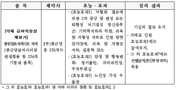당시 약평위는 치매로 인한 효능효과에는 급여를 유지하되, 그 외 효능효과에는 선별급여(본인부담 90%)를 적용키로 한 바 있다.