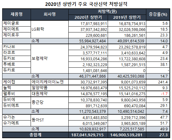 메디팜스투데이가 유비스트 자료를 토대로 2020년 상반기 주요 국산신약 처방실적을 살펴본 결과 시장규모는 전년 동기 대비 27.3% 증가한 1870억원에 달했다.