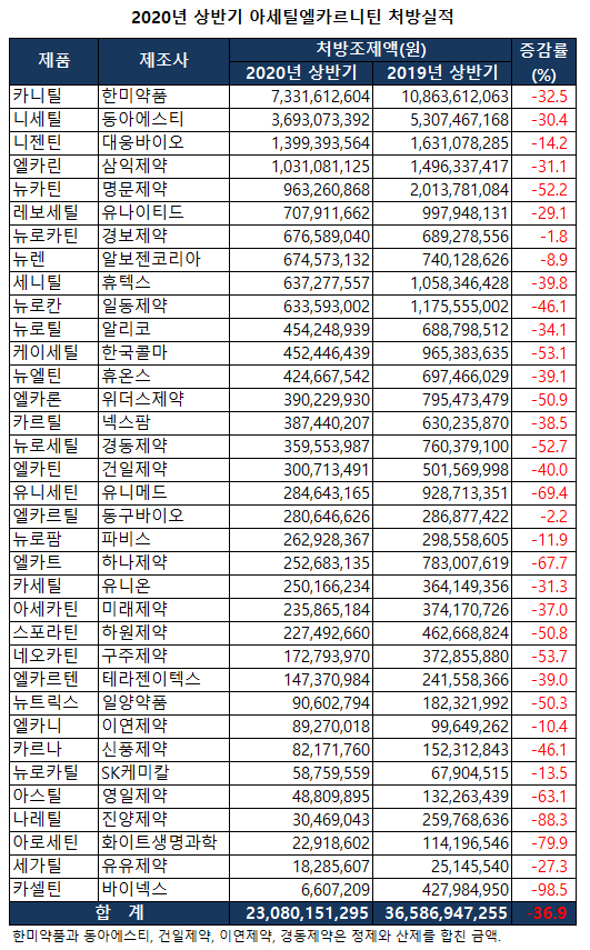 메디팜스투데이가 유비스트 자료를 토대로 올해 상반기 아세틸엘카르니틴 처방실적을 살펴본 결과 시장규모는 지난해 동기 366억원에서 231억원으로 36.9% 감소했다.