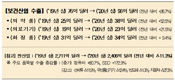 올해 상반기 의약품 수출액은 보건산업 분야 중 가장 높은 증가율을 기록했다. 특히 코로나19의 영향으로 올해 상반기까지 국내 생산 소독제의 수출이 폭발적으로 증가해 전년 동기 335만 달러에서 2.3억 달러로 6687%나 증가했다. 소독제는 미국, 일본, 중국 등을 포함한 88개국으로 수출한 것으로 집계됐다.
