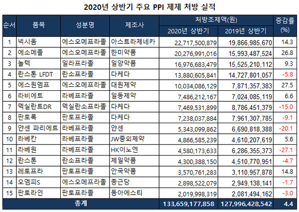 메디팜스투데이가 유비스트 자료를 토대로 올해 상반기 주요 PPI 제제 처방실적을 살펴본 결과, 15개 품목의 총 처방액은 1337억원으로 전년 동기 대비 4.4% 증가했다.