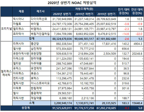 오리지널 중에서는 다이이찌산쿄의 릭시아나(성분명 에독사반)만이 홀로 성장했다. 릭시아나는 전년 동기에 비해서는 10.5%, 전반기에 비해서는 1.6% 증가한 317억원을 달성해 1위를 지켰다.
