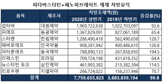 이밖에 안국약품의 페바로에프는 128.7% 증가한 9억 800만원, 동국제약의 피타론에프는 194.5% 증가한 7억 8900만원, 프라임제약의 리페스틴은 64.4% 증가한 7억 1000만원, 삼진제약의 뉴스타틴듀오는 114.5% 증가한 4억 6200만원, 지엘파마의 리로우펜은 70.7% 증가한 2억 6700만원을 기록했다.