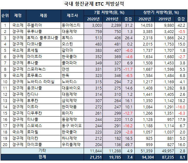 상반기 처방액도 경구제는 전년 동기 대비 3.2% 증가한 710억원, 국소도포제는 26.3% 증가한 233억원이었다.