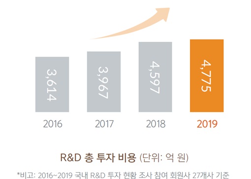 2016년부터 조사에 참여한 27개 회원사를 기준으로 R&D 투자 비용을 살펴본 결과 2016년 3,614억원, 2017년 3,967억원, 2018년 4,597억원, 2019년 4,775억원으로 증가했다.