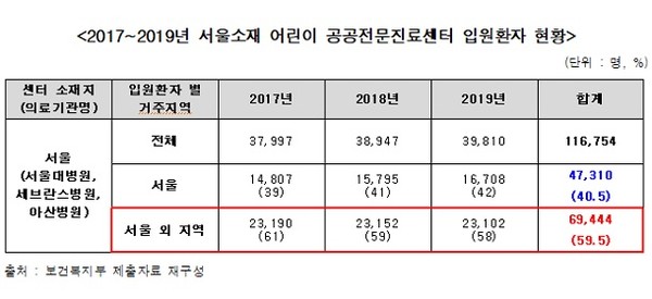 서울에 위치한 '어린이 공공전문진료센터'의 입원환자 60%가 서울 외 지역에 거주하고 있는 것으로 나타났다.