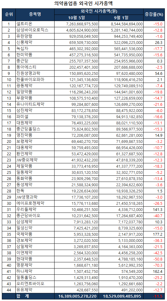 메디팜스투데이가 의약품업종 종목 44개사의 외국인 시가총액을 살펴본 결과 10월 5일 종가기준 16조 3890억원으로 지난달 첫 거래일인 9월 1일 18조 5291억원 대비 11.5% 감소했다.