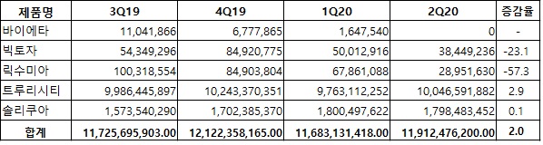 반면 아스트라제네카 바이에타(성분 엑세나타이드)는 지속적인 하락세를 이어가다 2분기에는 매출이 집계되지 않는 불운을 겪었다.