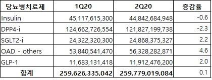 전체 당뇨병치료제 시장의 규모는 2597억원대를 보이며 1분기 대비 0.1% 성장하는데 그쳤다.