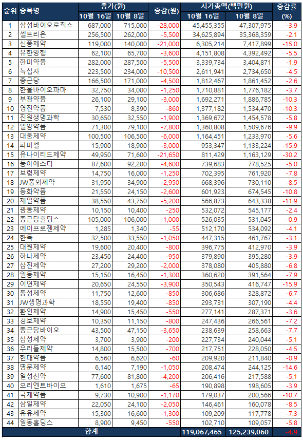 메디팜스투데이가 유가증권 의약품 관련 종목 44개사의 시가총액을 살펴본 결과, 10월 16일 종가기준 시총규모는 119조 674억원으로 10월 8일 대비 4.9% 줄었다. 금액으로는 6조 1716억원이 감소했다.