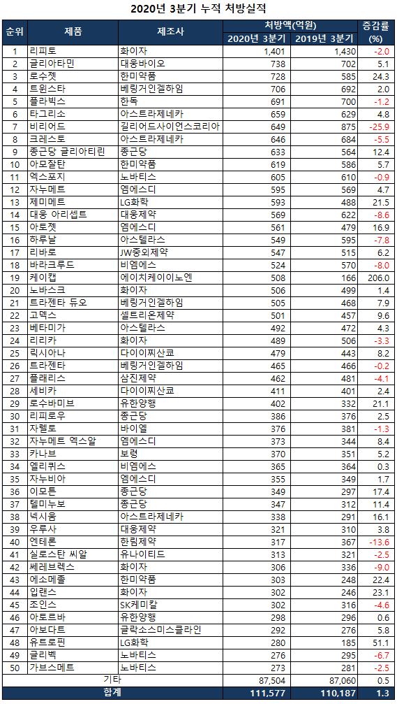 1위는 화이자의 '리피토'가 차지했다. 리피토는 올해 1401억원으로 지난해 같은 기간 1430억원보다 2.0% 소폭 줄었으나 여전히 2위보다 두 배 가까운 격차를 보이며 왕좌를 지켰다.