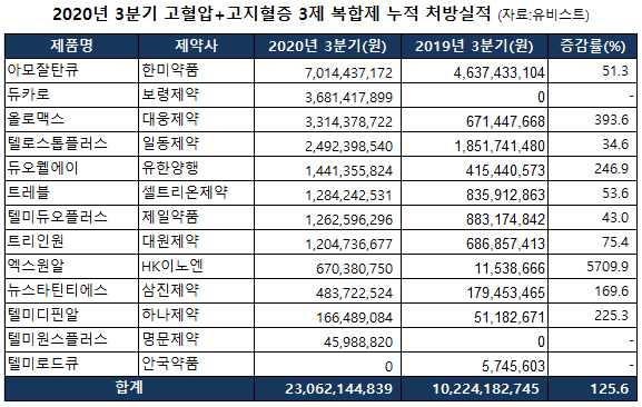 메디팜스투데이가 유비스트 자료 토대로 올해 3분기 고혈압+고지혈증 3제 복합제 시장을 살펴본 결과 누적 처방액은 230억원으로 전년 동기 102억원에서 125.6% 증가했다.