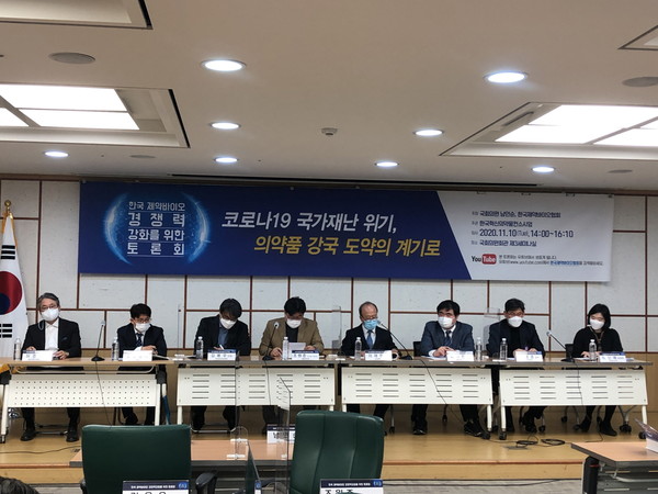10일 서울 여의도 국회의원회관에서 한국제약바이오협회(회장 원희목)와 남인순 국회 보건복지위원회 위원(더불어민주당)이 ‘코로나19 국가재난 위기, 의약품 강국 도약의 계기로’를 주제로 공동 주최한 국회토론회에서는 제약바이오산업 경쟁력 강화를 위한 전문가들의 발표와 열띤 토론이 이어졌다.