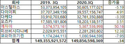 반면 아스텔라스, 다케다, 쿄와하코기린은 마이너스 성장을 이어갔다.