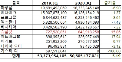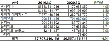 에자이의 3분기 원외처방실적은 지난해 3분기 35억원에서 올해 3분기 53억원으로 20억원 가깝게 성장했다.