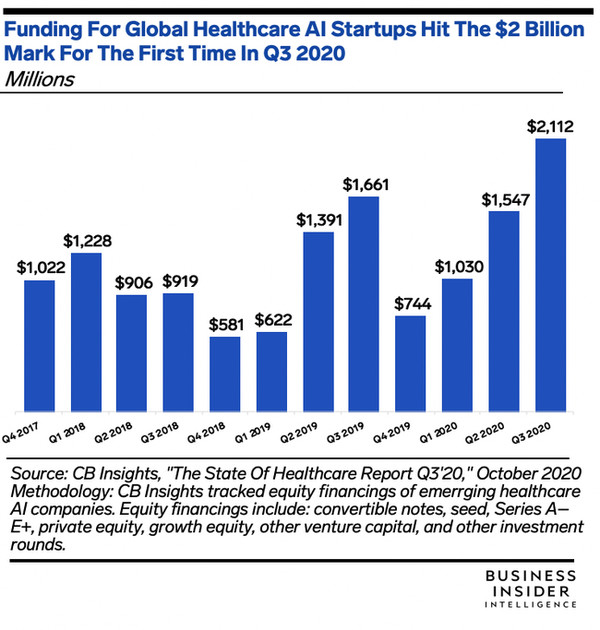 헬스케어 AI 스타트업은 2020년 3분기에 20억 달러 이상을 투자받았고, AI를 활용해 약품 제조 과정을 간소화한 스타트업들은 다른 헬스케어 분야에 이 기술을 배치한 스타트업과 비교해 가장 많은 돈을 받았다.