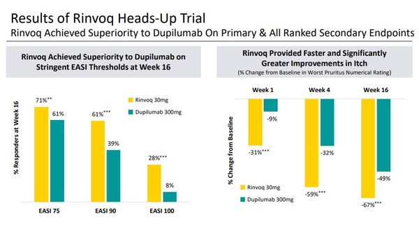 이런 험난한 과정을 겪은 듀피젠트에게 최근 아쉬운 뉴스가 전해졌다. 경쟁 약물로 빠르게 시장 진입을 준비 중인 애브비의 린버크(성분 유파다시티닙)가 듀피젠트와 린버크를 직접 비교 임상한(Heads Up 3b)결과를 발표한 것.