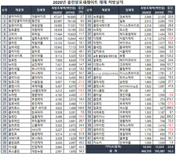 대부분 두 자릿수 증가율을 보인 가운데 글리세이트와 실버세린, 콜리아틴의 성장률이 높게 나타났다. 한미약품의 콜리네이트가 81억원으로 10위권 내에 들었다.