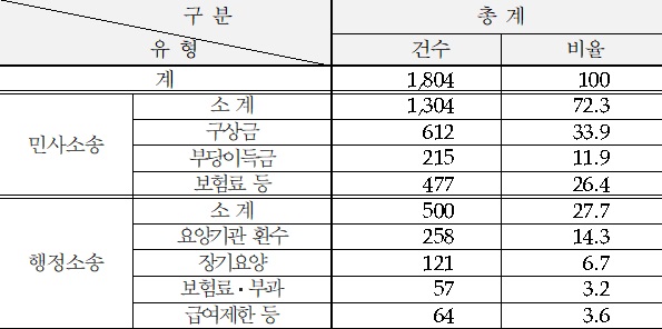 이 외에 부당이득금 반환 소송이 612건으로 33%대 비율을 보였고 부당이득금과 보험료 관련 소송이 각각 215건과 477건을 보였다.
