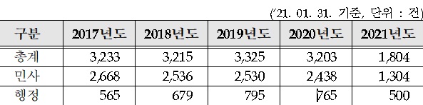 이 중 민사소송은 2017년도 2668건, 2018년 2536건, 2019년 2530건, 2020년 2438건으로 전체 소송 60%대를 넘어섰다.