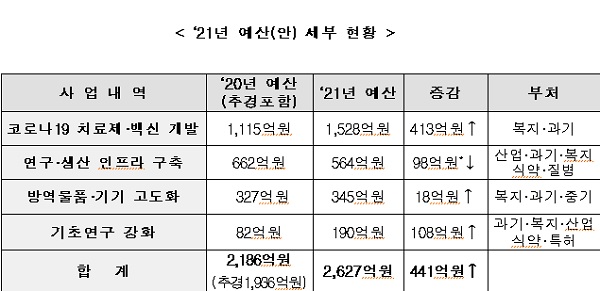 코로나19 치료제‧백신 개발과 임상시험 성공을 위해 1,528억원이 지원되고 치료제·백신 시험법 등 개발, 생산 기반 마련을 위한 실험 시설·장비 구축 등에 564억 원이 지원된다.