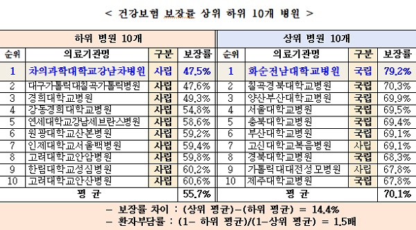 이중 건강보험 보장률이 가장 낮은 병원은 차의과대학교강남차병원으로 47.5%에 불과했고 반대로 화순전남대학교병원이 79.2%를 보여 가장 낮은 곳으로 조사됐다. 두 병원의 환자 의료비 부담은 약 2.5배 차이를 보였다.