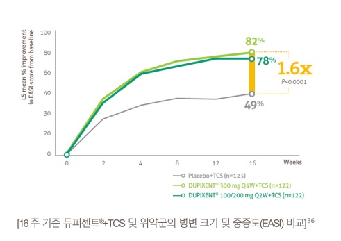 5일 온라이으로 진행된 듀피젠트 소아 적응증 기자간담회에서 리사 벡 교수는 만 6~11세 소아 중증 아토피피부염 환자 367명이 참여한 LIBERTY AD PEDS 3상 임상 연구를 소개하면서 "2주 혹은 4주에 한 번 투여할 경우 16주만에 피부 병변의 빠른 개선 효과를 보였다"면서 "듀피젠트와 국소 코르티코스테로이드(TCS)와 병용투여군에서 약 75%의 환자가 습진중증도평가지수(EASI) 75를 달성했으며 위약군은 26.8%에 그쳤다"고 설명했다.