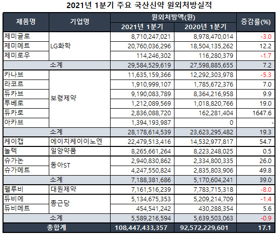 메디팜스투데이가 유비스트 자료를 토대로 2021년 1분기 주요 국산신약 실적을 살펴본 결과 시장규모는 전년 동기 대비 17.1% 증가한 1084억원을 기록했다.