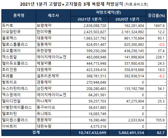메디팜스투데이가 유비스트 자료를 토대로 올해 1분기고혈압+고지혈증 3제 복합제 시장을 살펴본 결과 전체 처방액은 107억원으로 전년 동기 59억원에서 82.7% 증가했다.