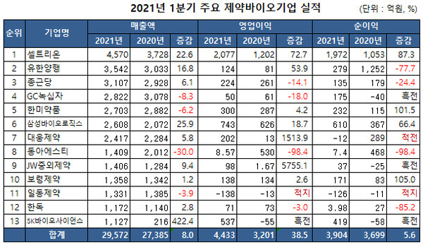 올해 1분기 상위 제약바이오기업들은 기업 간 온도 차는 있었으나, 전반적으로 호실적을 거둔 것으로 나타났다.
