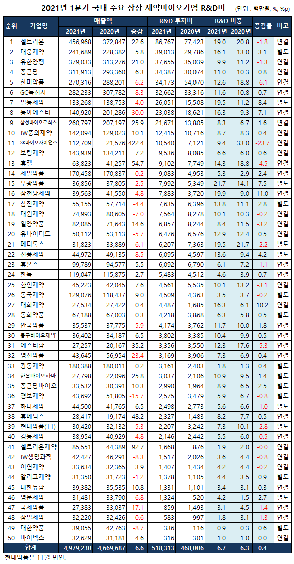 메디팜스투데이가 금융감독원 전자공시시스템에 제출된 2021년 1분기보고서를 토대로 50개 국내 주요 상장 제약바이오기업의 R&D 투자 금액을 살펴본 결과 이 같이 나타났다.