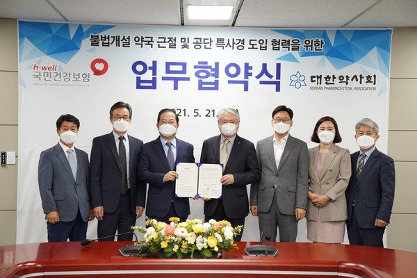 국민건강보험공단(이사장 김용익)은 대한약사회(회장 김대업)와 불법개설 약국의 진입억제 및 단속·적발에 효과적으로 공동 대응하기 위해 21일 업무협약을 체결했다고 밝혔다.