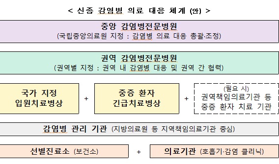 중앙(국립중앙의료원) 및 권역(7개소) 감염병전문병원을 지정·운영하고 국가 관리 음압병상을 확충하고, 각 지역에서 감염병에 효과적으로 대응하기 위해 권역 질병대응센터를 중심으로 협업 체계를 운영하고, 지방의료원에 감염 안전 설비를 지원한다는 방침이다.