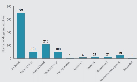 치료제 개발은 백신 보다 속도가 느린 상황인데 현재 전임상 단계에 있는 품목 수는 708개에 달하는 것으로 나타났다.