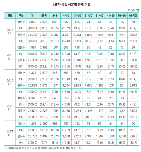 전년 2020년 1월 1일 기준 성분별 등재약이 21품목 이상인 약제의 총 비중은 57.8%(1만 3605품목)로 집계되어 전년 대비 2.3% 소폭 증가한 것으로 나타났다.