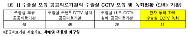 국회 보건복지위원회 최혜영 의원(더불어민주당)이 수술실을 보유하고 있는 공공의료기관을 대상으로 제출받은 자료에 따르면, 수술실을 보유하고 있는 61개 공공의료기관 중 11개 기관만 환자 동의하에 CCTV 녹화가 이뤄지는 것으로 나타났다.