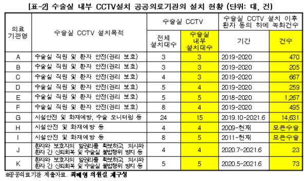 환자 동의하에 수술실 내부 CCTV 녹화가 이뤄지는 공공의료기관을 살펴보니, 대부분의 기관이 수술실 직원 및 환자 안전보호를 위해 수술실 내부에 CCTV를 설치했으며, 수술실 규모 등에 따라 3대~15대 가량 설치한 것으로 나타났다.