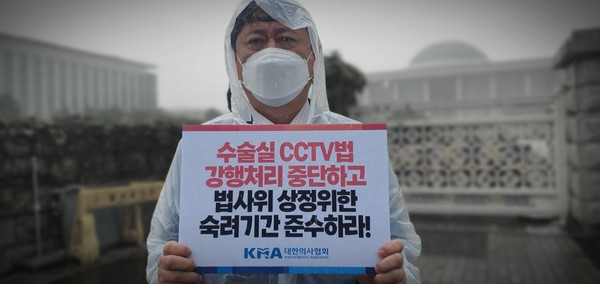 의료계의 반대에도 수술실 CCTV 강제 설치 의무화 법안이 국회 법제사법위원회 논의를 앞두고 있는 가운데, 24일 오전 대한의사협회(회장 이필수) 이정근 상근부회장이 법안 통과를 저지하기 위한 1인 시위를 펼쳤다.