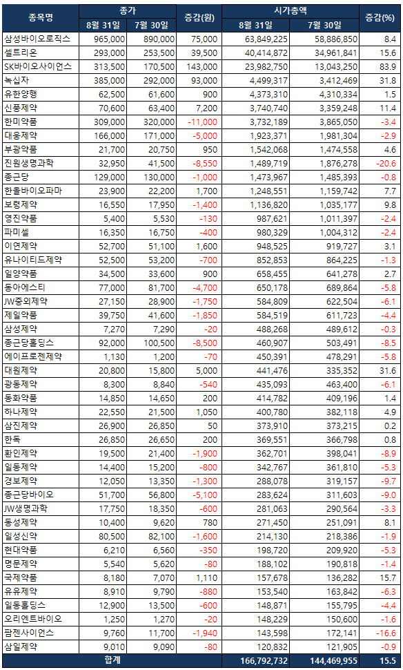 메디팜스투데이가 의약품업종 종목 45개사의 시가총액(이하 시총)을 살펴본 결과 8월 31일 종가기준 시총은 166조 7927억원으로, 한달 전인 7월 30일 144조 4701억원보다 15.5% 증가했다. 금액으로는 22조 3228억원이 늘어났다.