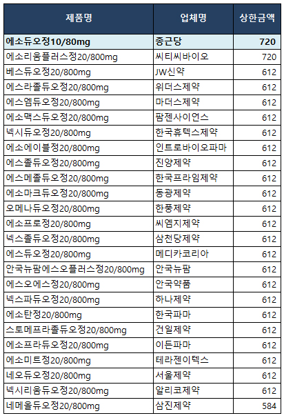 약제급여 목록·급여상한금액표를 보면 에소듀오는 정당 720원이다. 씨티씨바이오가 생동시험을 직접 수행한 에소리움플러스도 동일한 정당 720원으로 등재됐다.