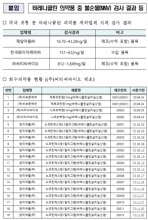 다만 이미 시중에 유통 중인 바레니클린 의약품 중에서 NNV 검출량이 733ng/일을 초과한 제품은 업체에서 자발적으로 회수하기로 했다.