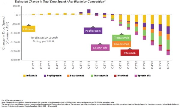 이러한 절감은 주로 다양한 종양 치료에 사용되는 허셉틴(Herceptin, trastuzumab)과 아바스틴(Avastin, bevacizumab), 자가면역질환 치료제 레미케이드(Remicade, infliximab), 화학요법 관련 혈소판 감소증 치료제 뉴포젠(Neupogen, filgrastim)과 뉴라스타Neulasta, pegfilgrastim) 등의 바이오시밀러 버전에서 유래했다.